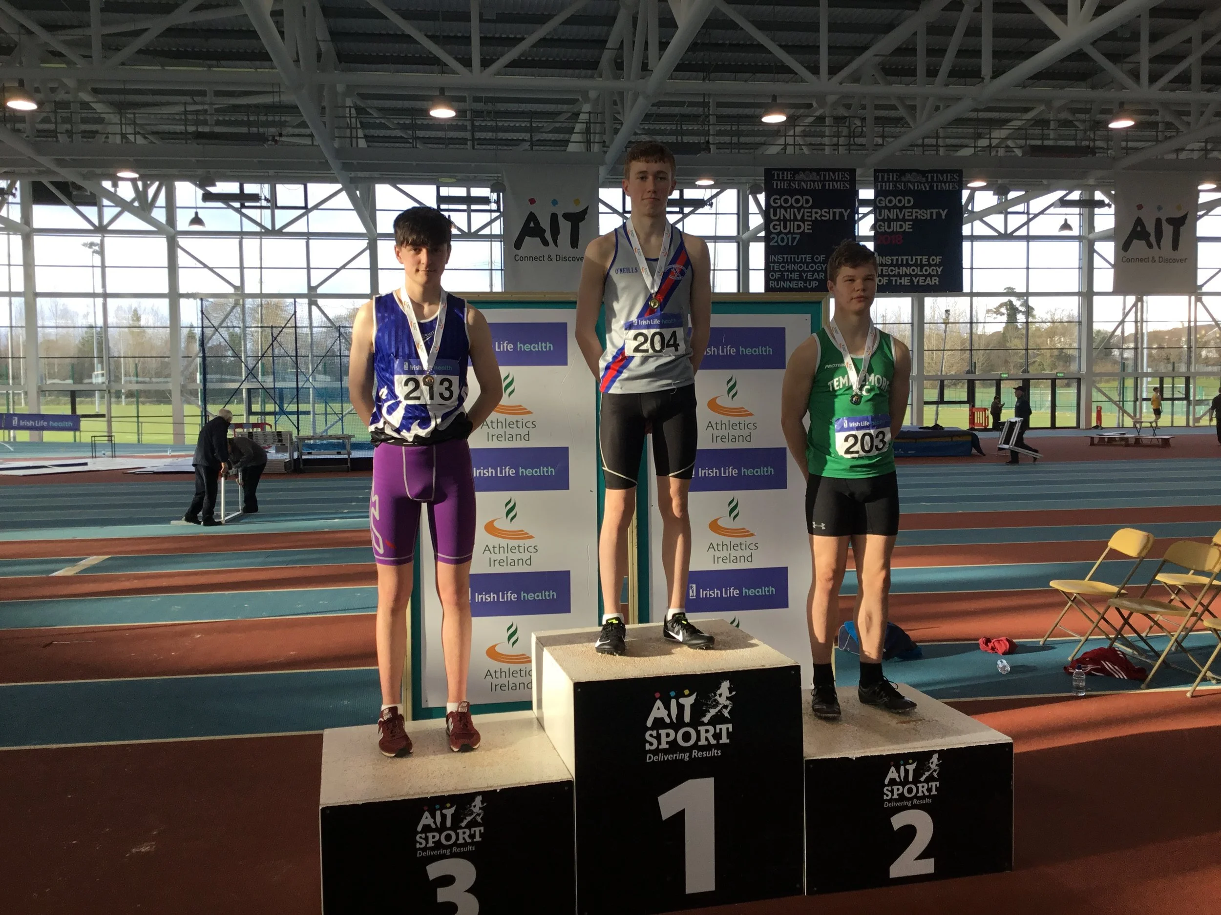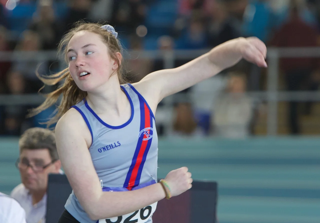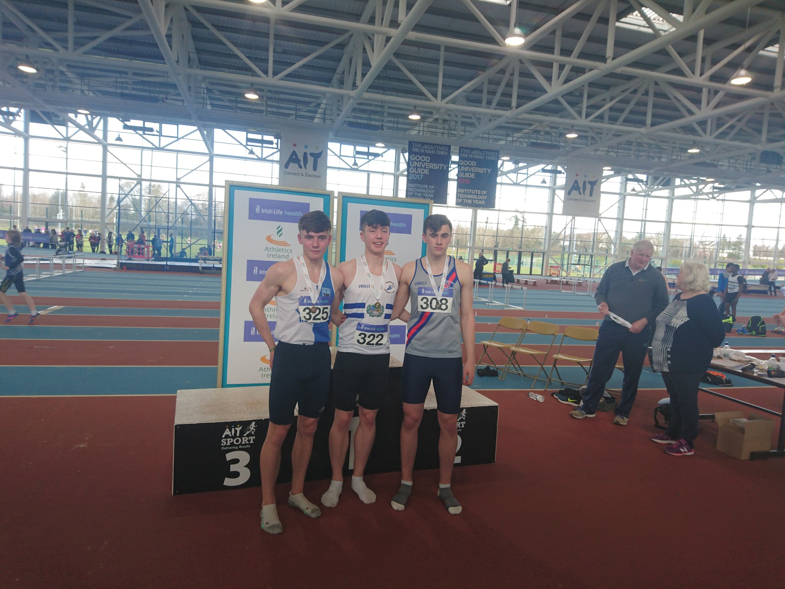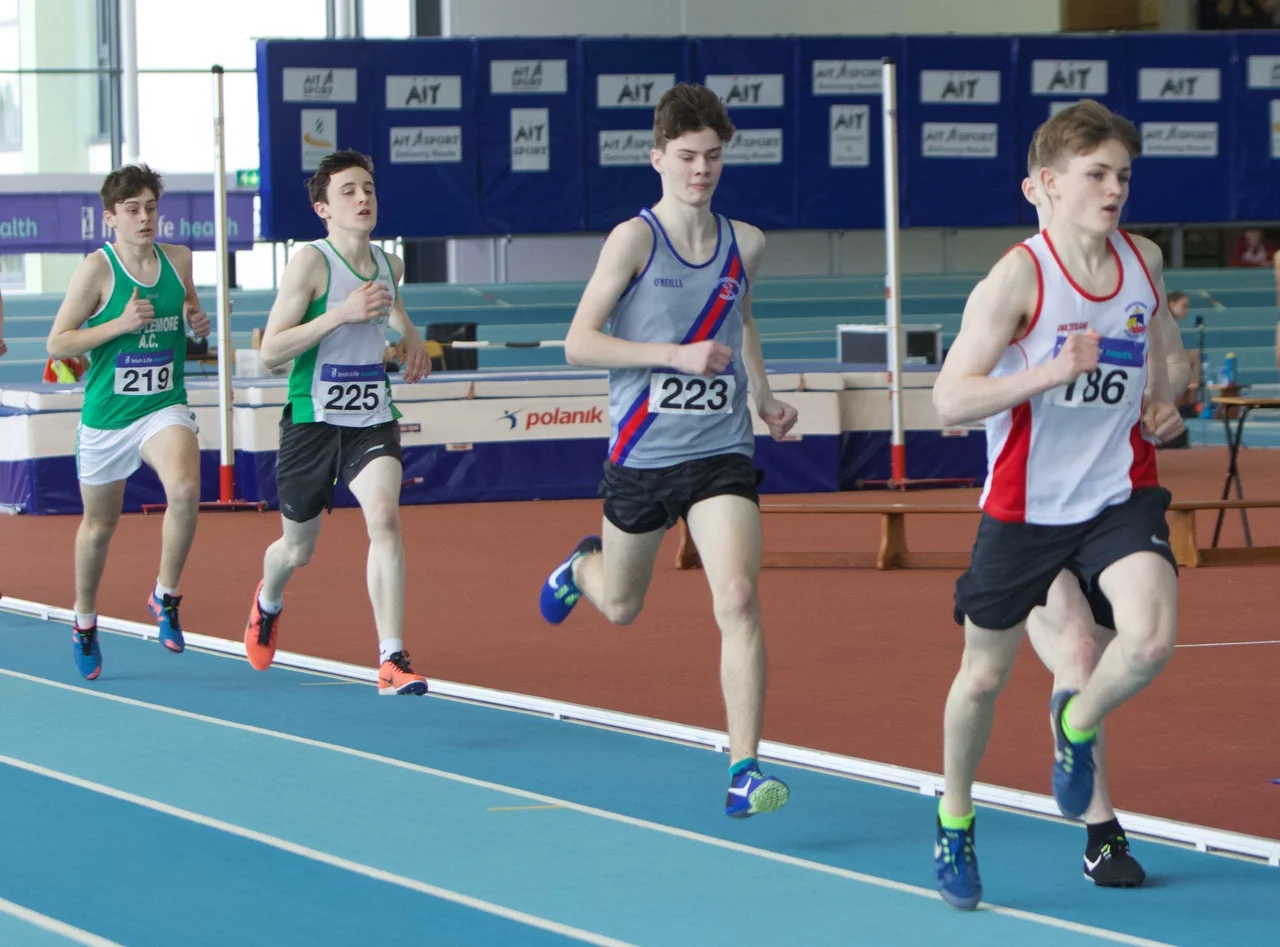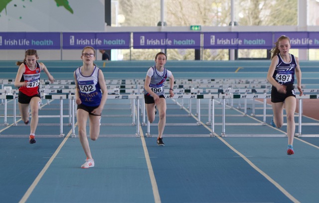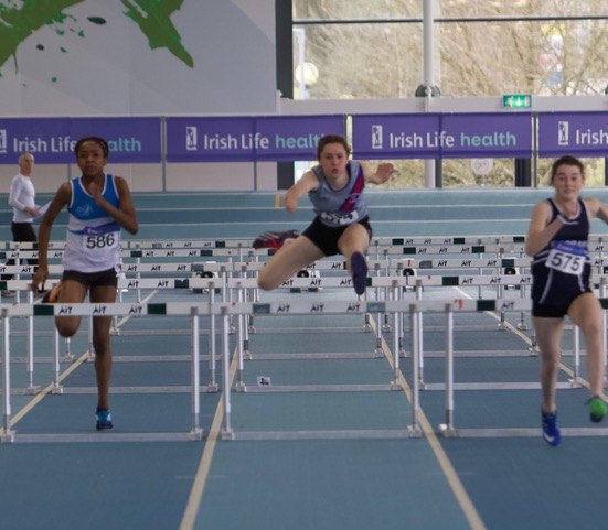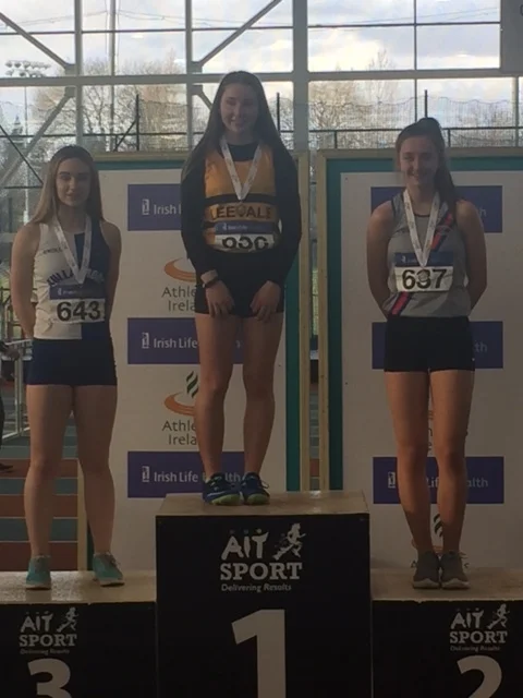 Cian Dunne produced a gold medal performance yesterday in A.I.T., in the final of the U.16 boys hurdles, winning his first ever individual national title. Cian showed great strength and determination, as he hurdled to gold and a P.B of 8.79. It was great to see the smile on his face as he stepped up on the rostrum to receive his medal. His training partner, Laura Gallagher, had to be happy with silver on this occasion, having won the gold for past two years. There is no doubt that she will bounce back to gold in future competitions. Others winning silver were Ciarán Carthy, in the U.18 boys 200m (22.67), following up on his silver in the 400m; Molly Hourihan U.18 girls 200m (25.78) and Aimee Kenny U.16 girls 800m (2.21.30). Ben Jones also ran a good race in the U.18 boys 800m finishing 3rd (1.59.38) with Emma Ryan 3rd U.18 girls 800m (2.18.95). Abi Kennedy just missed out on a medal in the U.14 girls shot (10.77), with her brother 5th in the U.12 boys 8.06, and Charlie Thornton 5th U.18 boys Triple Jump 11.47. Corrine Kenny wasn’t at her best as she faded to 4th in the U.17 800m (2.21.00) and Patrick Tucker was 6th in the U.17 200m (23.24 heat 23.54 final). David Bosch also ran very well to reach the U.15 boys hurdles final and finished 6th in 9.60 and Darcy Hutter just missed a bronze medal by 2 centimetres in the U.12 Long Jump with a leap of 4.02, finishing 4th. Well done to all!