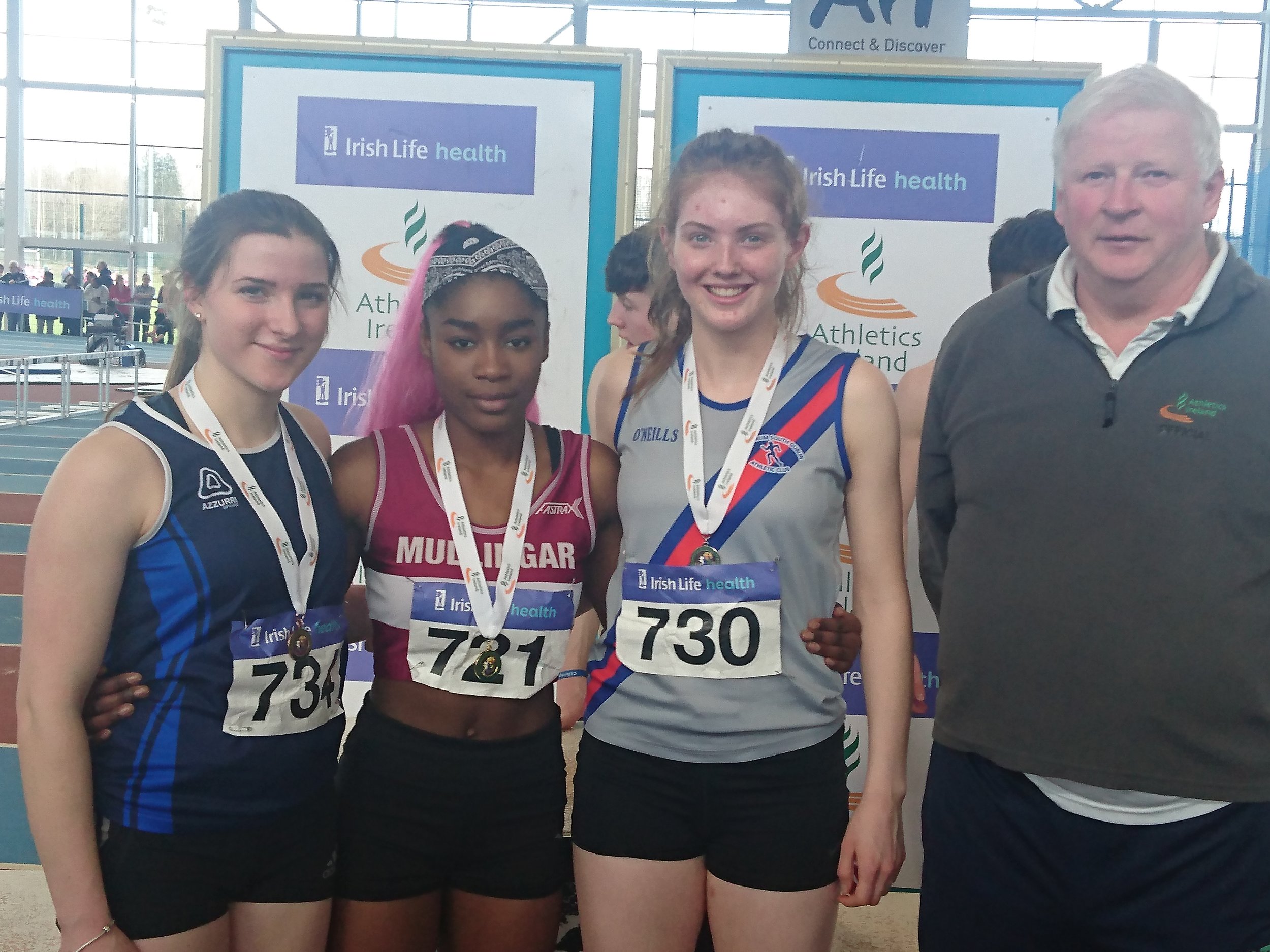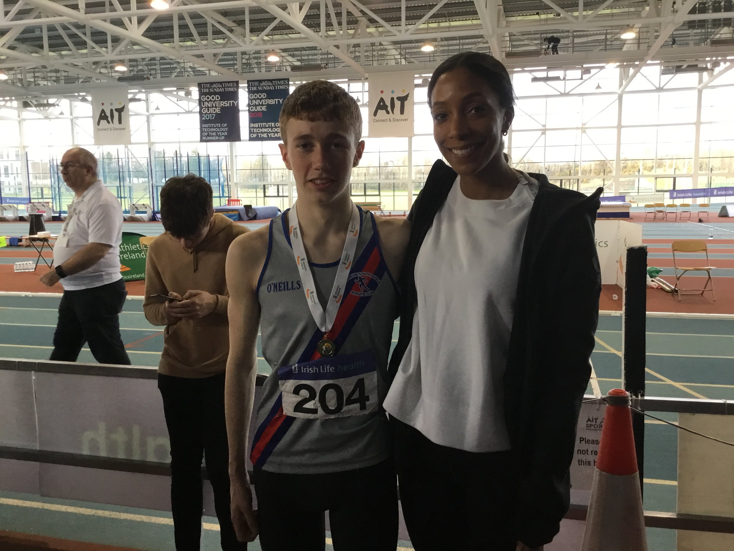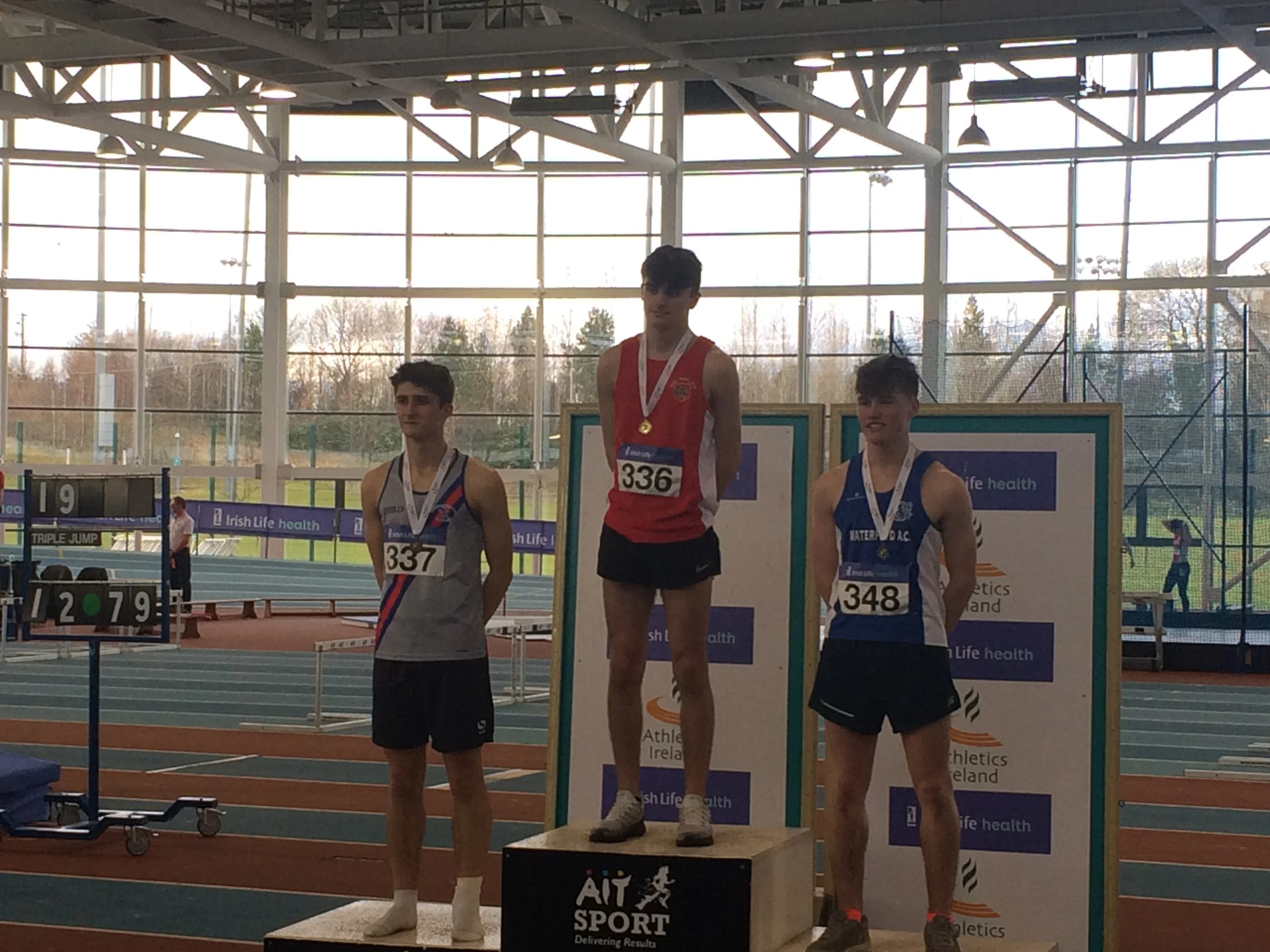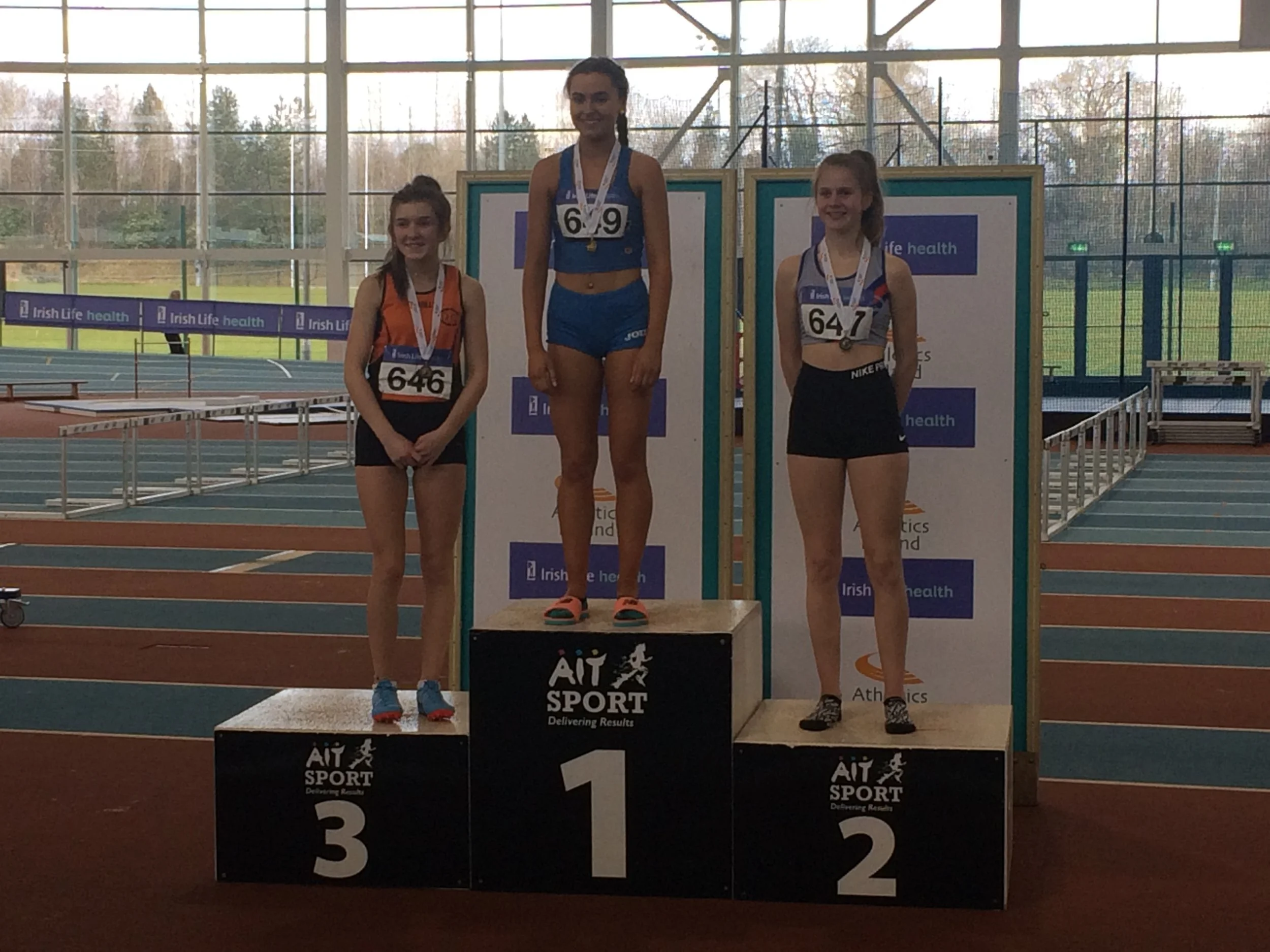 Cian Dunne produced a gold medal performance yesterday in A.I.T., in the final of the U.16 boys hurdles, winning his first ever individual national title. Cian showed great strength and determination, as he hurdled to gold and a P.B of 8.79. It was great to see the smile on his face as he stepped up on the rostrum to receive his medal. His training partner, Laura Gallagher, had to be happy with silver on this occasion, having won the gold for past two years. There is no doubt that she will bounce back to gold in future competitions. Others winning silver were Ciarán Carthy, in the U.18 boys 200m (22.67), following up on his silver in the 400m; Molly Hourihan U.18 girls 200m (25.78) and Aimee Kenny U.16 girls 800m (2.21.30). Ben Jones also ran a good race in the U.18 boys 800m finishing 3rd (1.59.38) with Emma Ryan 3rd U.18 girls 800m (2.18.95). Abi Kennedy just missed out on a medal in the U.14 girls shot (10.77), with her brother 5th in the U.12 boys 8.06, and Charlie Thornton 5th U.18 boys Triple Jump 11.47. Corrine Kenny wasn’t at her best as she faded to 4th in the U.17 800m (2.21.00) and Patrick Tucker was 6th in the U.17 200m (23.24 heat 23.54 final). David Bosch also ran very well to reach the U.15 boys hurdles final and finished 6th in 9.60 and Darcy Hutter just missed a bronze medal by 2 centimetres in the U.12 Long Jump with a leap of 4.02, finishing 4th. Well done to all!