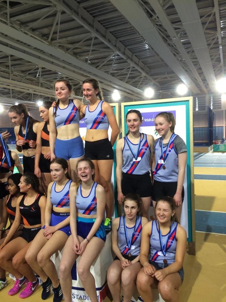A huge number of juvenile athletes descended on the National Indoor Arena, Abbotstown on Friday night for the Even Age Dublin Relay Championships. D.S.D., U.18 Girls and U.16 Girls impressed with great front running and duly came home with the gold medals and qualification to the National Championships in Athlone in March. As well as winning the U.16 Girls our second team in this age group finished 3rd to claim the bronze medals. Our U.14 Girls finished 3rd, and U.16 boys 2nd. With three of our U.18 Boys unavailable, we had to call on our subs, with two of them being from the U.17 boys, who put up great performances, but unfortunately they just missed the medals finishing in 4th place. Results as follow: U18 Girls 1st: Sarah Gaughran; Corinne Kenny; Roisin Healy; Molly Hourihan U.16 Girls “A” 1st : Laura Gallagher; Hannah Murray; Cara Murphy; Aimee Kenna U.16 Girls “B” 3rd : Erica Doyle; Rebecca Lynch; Iida Bradshaw; Claudia Moran U.14 Girls 3rd: Molly Mullally; Becky Carthy; Ellie Dunphy; Abi Kennedy U.16 Boys 2nd: Cian Dunne; Joseh McBreen; Daniel Jones; Morgan Clarkson U.18 Boys 4th: Gavin Doran; Patrick Tucker; David Hearne; Ben Jones Other Finalists: Boys U.14: Jamie Byrne, Robert Hayes, David Roche: Cillian O’Sullivan Boys U.12: Rory McDonagh; Cian Dunphy; Sean Healy: Joe Kennedy Girls U.12: Darcy Hutter; Rachel Byrne; Emma Johansson; Lulu Flood